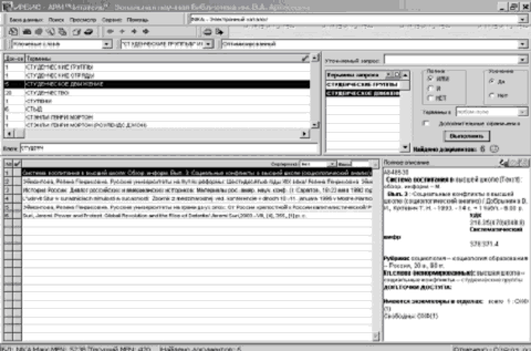 Поиск в базе данных будет осуществляться только после нажатия кнопки «Выполнить». Непосредственно под кнопкой будет указано число найденных документов, а в нижней части экрана, слева, будет представлен список найденных документов, а справа – библиографическое описание выделенного документа.