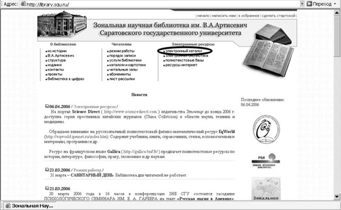 На сайте Зональной научной библиотеки им. В. А. Артисевич Саратовского госуниверситета – http://library.sgu.ru - в разделе «Электронный каталог» (рис. 1).