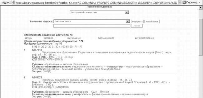 Для перехода между различными частями окна вывода используется соответствующая линейка, в которой диапазон порядковых номеров библиографических описаний разбит на блоки. В нашем примере 177 найденных описаний разбиты на блоки по 10 описаний, т.е. на 18 частей. На экран выводятся ссылки на первые шесть из них и на последний блок.