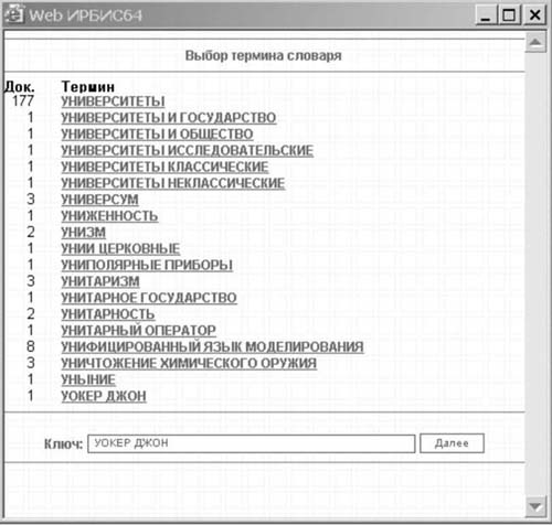 В нашем примере выведенный фрагмент словаря будет начинаться со слова «университеты». Рядом с этим словом стоит число 177, указывающее на количество документов, содержащих этот элемент.