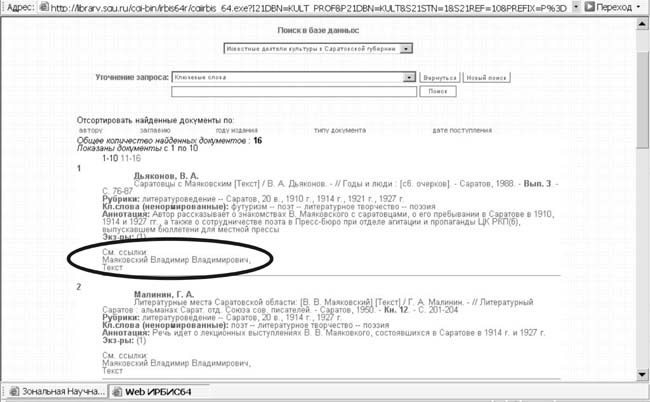В окне просмотра результатов поиска базы данных «Известные деятели культуры в Саратовской губернии» после библиографического описания добавлена область «Смотри ссылки» (рис. 5).
