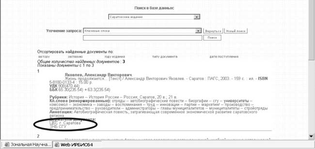 В окне просмотра результатов поиска базы данных «Саратовские издания» после библиографического описания добавлена область «Держатели документа». В этой области указано, в каких библиотеках города – участниках проекта находится найденное издание (рис. 6).