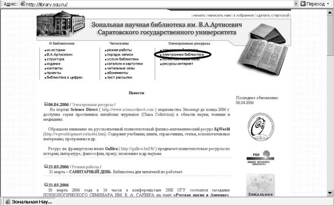 Как и в электронный каталог, войти в электронную библиотеку можно со стартовой странички библиотеки http://library.sgu.ru (рис. 1).
