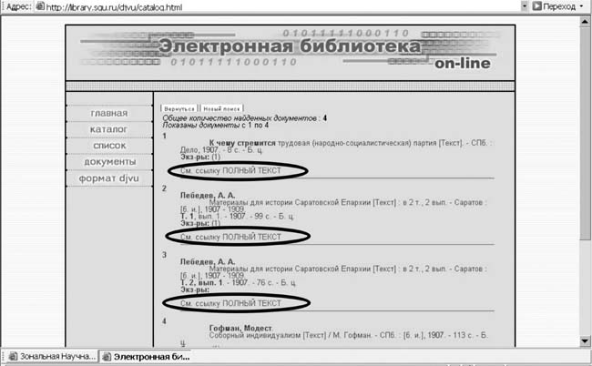 Отметим, что первые документы в электронной библиотеке размещены в графическом формате, т.е. отсутствует возможность поиска по тексту. Все последние документы размещаются в режиме «Текст под изображением». В этом режиме на экран выводится графическое изображение страниц документа, но под ним есть распознанный текст, что позволяет осуществлять текстовый поиск. Текст документа не редактируется, поэтому для изданий, оригинал которых напечатан на плохой бумаге, и для ветхих изданий возможны ошибки распознавания.