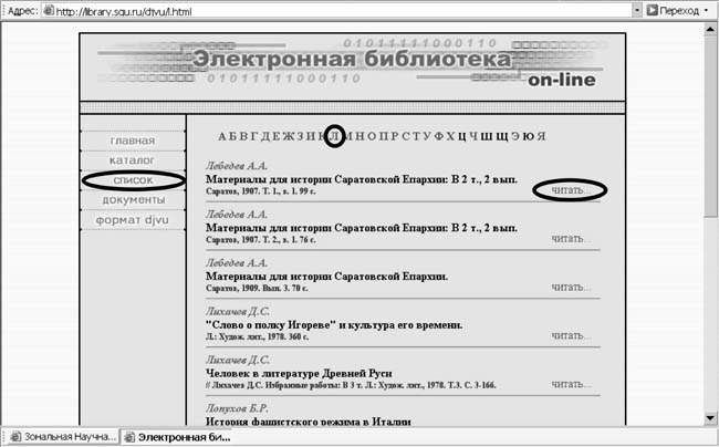 Второй вариант поиска – поиск по списку. В этом режиме читателям предлагается алфавитный список имеющихся изданий. Переход осуществляется нажатием соответствующей буквы в верхней части экрана, просмотр текста – нажатием надписи «читать…» (рис. 4).