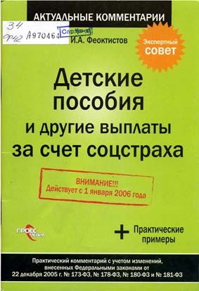 Феоктистов И. А. Детские пособия и другие выплаты за счёт соцстраха. [+ Практические примеры. Внимание!!!. Действует с 1 января 2006 года]: практ. коммент. с учётом изменений, внесён. Федер. законами от 22 дек. 2005 г. № 173-ФЗ, № 178-ФЗ, № 180-ФЗ, № 181-ФЗ / И. А. Феоктистов. – М. : ГроссМедиа, 2006. – 80 с.