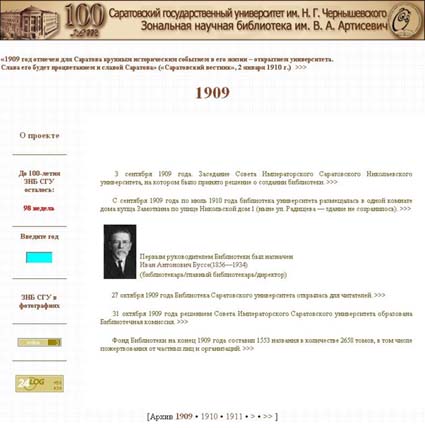 Осенью 2009 года Зональная научная библиотека им. В. А. Артисевич Государственного образовательного учреждения высшего профессионального образования «Саратовский государственный университет им. Н. Г. Чернышевского» будет отмечать своё столетие.