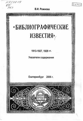 Рожнова В. И. «Библиографические известия» 1913–1927, 1929 гг. : указ. содержания / В. И. Рожнова. – Екатеринбург : [б. и.], 2006. – 164 с. : фот., портр.