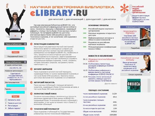 Научная электронная библиотека (НЭБ) РФФИ – Многолетний проект Российского Фонда фундаментальных исследований. Представлены естественно-научные, общественно-политические журналы, в том числе и на русском языке. Недавно в коллекцию добавились полные тексты журналов издательства Elsеvier в области нанотехнологий – ценное новшество ввиду отсутствия прямого доступа к журналам этого издательства.