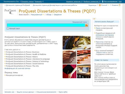 ProQuest Dissertations & Theses – База данных зарубежных диссертаций. Собирается с 40-х годов прошлого века. Начиналась с работ американских учёных, сейчас включает диссертации авторов из десятков стран мира. Предоставлена возможность российским учёным добавлять в ресурс собственные защищённые работы.