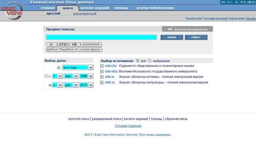 East View – база данных русскоязычных журналов: научных, общественных, литературных. Особенно стоит отметить «Вестник МГУ» и полные архивы журналов «Вопросы истории» и «Вопросы литературы».