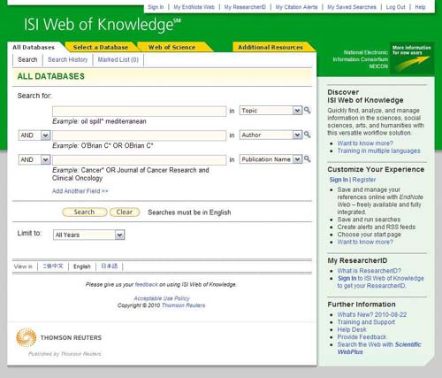 ISI Web of Knowledge – политематическая реферативная база данных. Представлены и естественные, и точные, и общественные науки. Особую ценность, конечно, представляет система определения индекса цитирования публикаций. Сейчас он стал «проходным баллом» на получение грантов и аттестации для каждого учёного, и знать его необходимо. Однако можно использовать ресурс и в качестве достаточно полной реферативной БД по самым разным разделам науки.