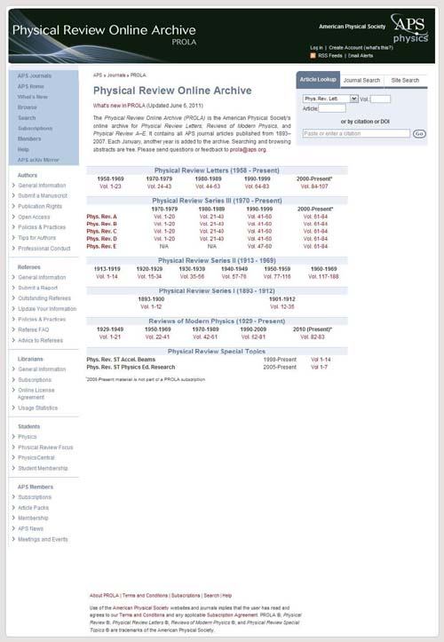 Журналы Американского физического общества – знаменитые «Physical Review» серий A–E, «Physical Review Letters» и «Reviews of Modern Physics»! Доступен архив с 1893 года.