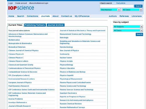 Журналы Института Физики (IOP) – более 40 физических журналов: Европа, Китай, Россия. К сожалению, отечественные журналы в подписку не входят… В прошлом году издательство огорчило подписчиков, введя отдельную подписку на журналы с 2000 года и архив. Хотя весь архив каждого журнала оплачивается один раз, цены оказались неподъёмными. Хорошо хоть, что статьи 1990-х годов доступны на НЭБ РФФИ.