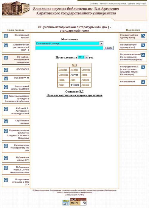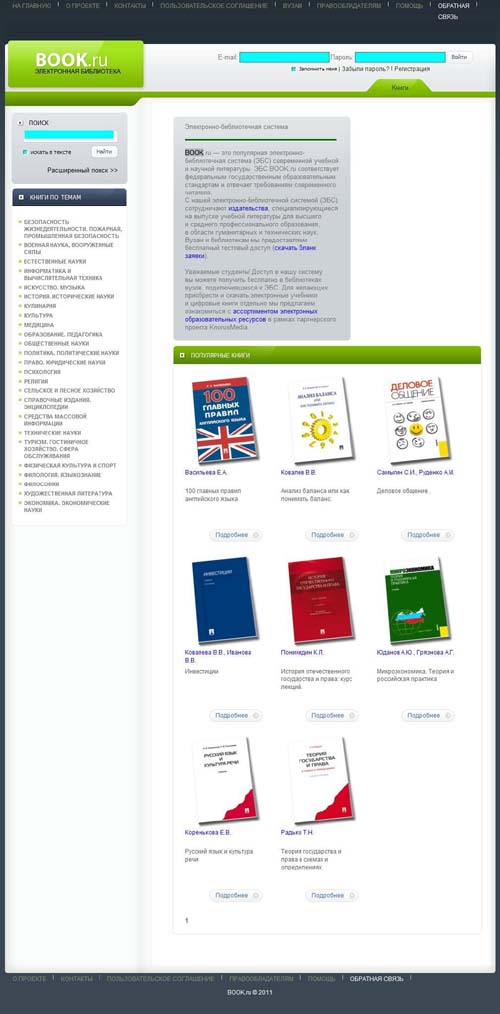 Электронная библиотека книг издательств «Кнорус», «Владос», «Дашков и Ко». В основном указанные издательства специализируются на экономической, социологической и общественно-политической литературе. По сравнению с другими ЭБС, блок книг, доступных СГУ, здесь невелик, но вместе с тем есть два существенных плюса. Во-первых, есть возможность копировать фрагменты книг в обычный текстовый формат; во-вторых, ЭБС даёт возможность работать с её ресурсами из любой точки входа в Интернет, в том числе и из дома. Для этого необходимо пройти короткую индивидуальную регистрацию на сайте ЭБС, затем получить ключ входа в комнате 110 ЗНБ СГУ.