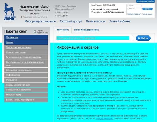 Электронная библиотечная система издательства «Лань» предоставляет возможность приобретения электронных книг по различной тематике. Библиотекой приобретены пакеты «Математика» (119 электронных книг) и «Физика» (79 электронных книг). В основном представлены классические учебники по физике и математике. Несомненным плюсом данной ЭБС является возможность сгенерировать фрагмент книги для копирования.