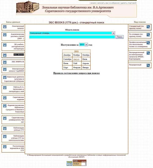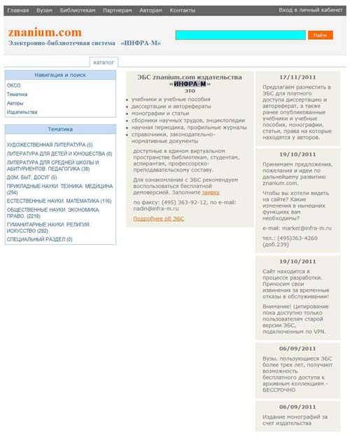 ЭБС «ИНФРА-М» – книги издательств «Инфра-М», «Альфа-М», «Вузовский учебник», ИД РИОР, «Магистр», «НОРМА», «Форум» и др. Доступны 2363 электронные книги. До конца 2011 года – 3500 электронные книги. Почти 1000 книг 2010–2011 гг. издания.