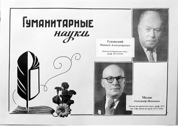 На выставке представлены труды профессоров, изданные в военное лихолетье: Г. А. Гуковского – проректора по научной работе СГУ до 1948 года, М. П. Алексеева – зав. каф. всеобщей литературы историко-филологического факультета СГУ (1942–1944), В. В. Мавродина – зав. каф. исторического факультета СГУ(1942–1944) и выдающегося учёного-филолога В. Е. Евгеньева-Максимова.
