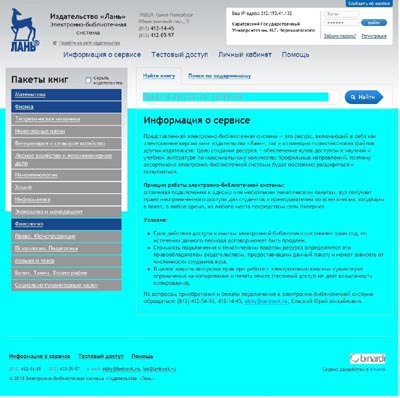 ЭБС издательства «Лань» (http://e.lanbook.com) привлекает внимание читателей своей простотой. В 2011 году СГУ был подписан на пакеты «Математика» и «Физика» этого издательства. В 2012 году появилась возможность в рамках этой же ЭБС получить доступ к электронным версиям книг других издательств, и СГУ подписан на третий пакет – пакет «Филология» издательства «Флинта».