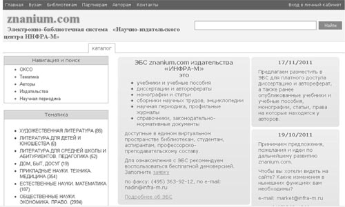 Немного иной способ доступа у ещё одной хорошо знакомой читателям ЗНБ СГУ ЭБС – «Znanium.com» (http://znanium.com). Работа с ЭБС также возможна с любого компьютера, подключённого к Интернет, но авторизационные данные (логин и пароль) можно получить только в ЗНБ СГУ или в Институте открытого образования. При регистрации каждый читатель указывает адрес своей электронной почты, на которую могут передаваться электронные копии отдельных страниц из книг, входящих в эту ЭБС. Число таких страниц для каждой книги индивидуально и определяется Договором между автором и правообладателем ЭБС. Как правило, это 5–10% от объёма книги.
