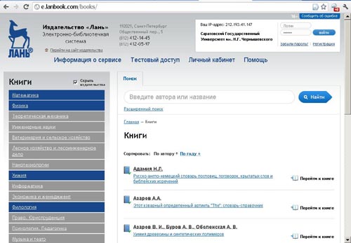 Работая с каталогом, можно либо просто пролистать список книг, приведённых в алфавитном порядке (СГУ доступно 136 книг по математике, 91 книга по физике, 73 книги по химии, 456 книг по филологии и 16 книг по технологии пищевых производств), либо воспользоваться поиском.
