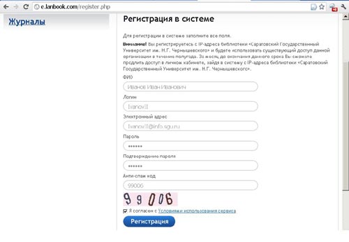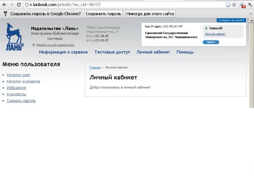 Регистрация в системе даёт возможность пользоваться личным кабинетом, формировать свои подборки, готовить конспекты, оставлять закладки и т. д. Поэтому мы настоятельно рекомендуем всем заинтересованным в работе с этой ЭБС зарегистрироваться. Зарегистрироваться надо один раз, с любого компьютера СГУ. Далее через каждые полгода необходимо продлевать пользование данной ЭБС (также с любого компьютера СГУ).