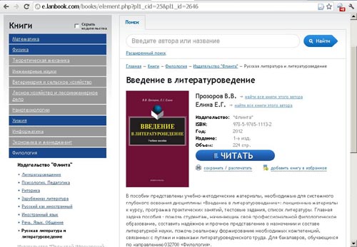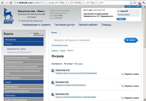 Ещё больший объём потребовался бы для описания книг, доступных в данной ЭБС. «Основы математического анализа» и «Курс дифференциального и интегрального исчисления» Г. М. Фихтенгольца, «Курс общей физики» И. В. Савельева и «Основы квантовой механики» Д. И. Блохинцева, «Введение в литературоведение» В. В. Прозорова и Е. Г. Елиной и «Зарубежная литература XX века» И. В. Кабановой – вот только по два хорошо знакомых студентам СГУ учебника из доступных в СГУ разделов ЭБС.