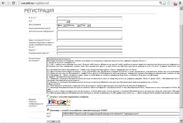 В предложенной для регистрации форме необходимо ввести свои фамилию, имя и отчество так, как они записаны в читательском билете, указать адрес своей электронной почты, придумать логин и пароль для работы в системе, прочитать и дать согласие на соблюдение условий лицензионного соглашения, выбрать наш университет из списка (обратите внимание на то, что университет указан как ФГБОУ ВПО «Саратовский государственный университет имени Н. Г. Чернышевского» и стоит в соответствующем месте алфавитного списка – на букву «Ф»). В качестве кода необходимо ввести номер своего читательского билета. После введения символов, защищающих систему от роботов, и нажатия на кнопку «ОК» – процедура оформления заявки на регистрацию завершена. На Вашу электронную почту будет выслана ссылка, перейдя по которой Вы подтвердите свою заявку и станете полноправным пользователем Национального цифрового ресурса «РУКОНТ».