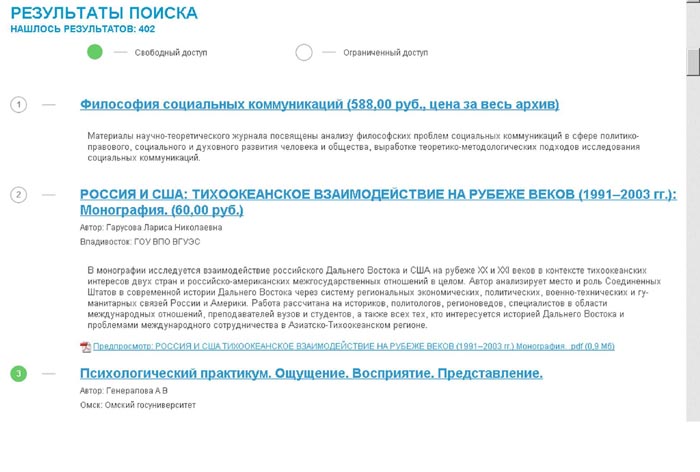 Результаты такого тематического поиска выводятся в виде списка, в котором зелёным цветом отмечены издания свободного доступа, серым – платные издания.