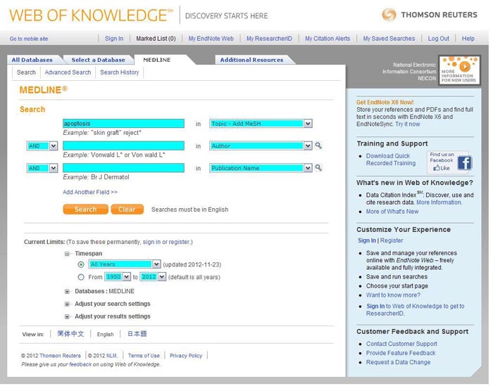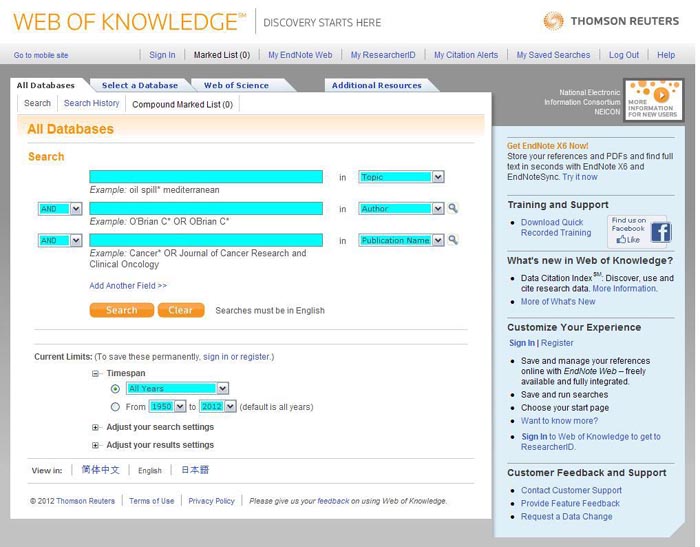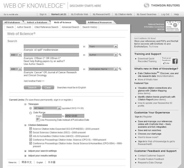 На странице с адресом http://apps.webofknowledge.com пользователь увидит окно поиска по всем базам: