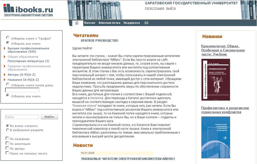 Мы продолжаем знакомство читателей с Электронно-библиотечными системами (ЭБС), доступными в СГУ в 2012/2013 году http://library.sgu.ru/ebs.html. В предыдущих двух номерах газеты «Моя Научка» рассказывалось об ЭБС издательства «Лань» и ЭБС «РУКОНТ». Сегодня Вашему вниманию предлагается краткое описание ЭБС «ibooks.ru».