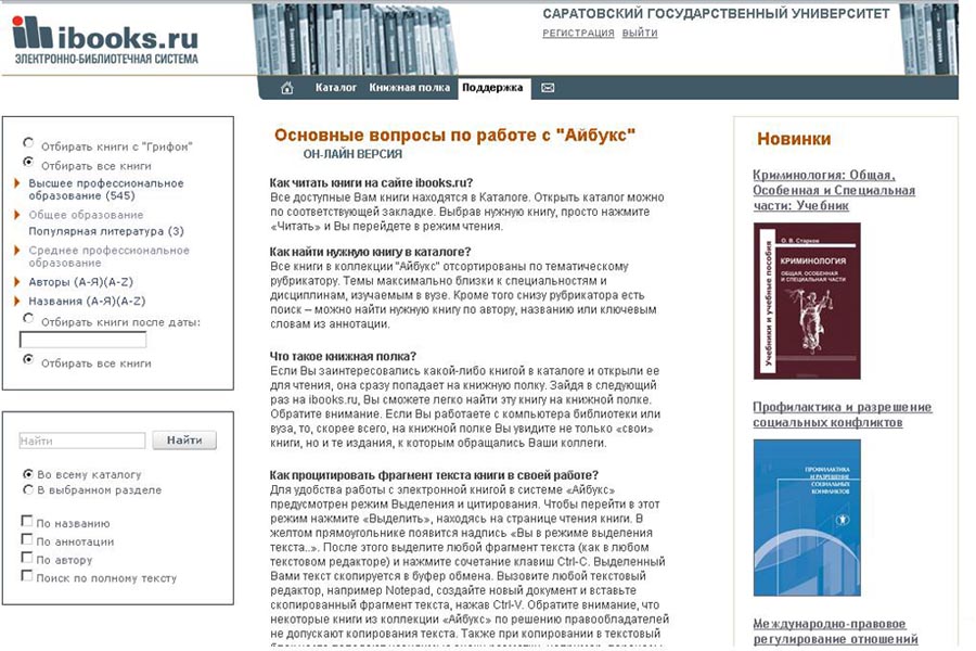 На стартовой страничке ЭБС в разделе «Поддержка» Вы можете найти ответы на наиболее часто встречающиеся вопросы по работе с этой ЭБС.