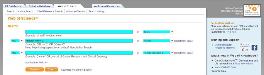 и в поле «Author» вводим (латинскими буквами!) сначала фамилию, а затем пробел и инициалы. Используйте сокращения и выполняйте поиск альтернативных вариантов написания, чтобы найти варианты имени. Так, знак «*» на месте второго инициала «заставит» программу